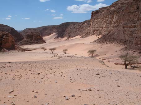 Tal (Wadi) mit einigen Akazien (Acacia tortilis); die wenigen Pflanzen,