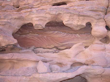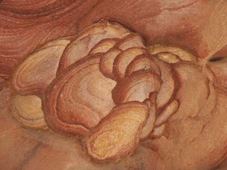 unterschiedliche Gelb-Braun-Rot-Färbung des Sandsteines. |